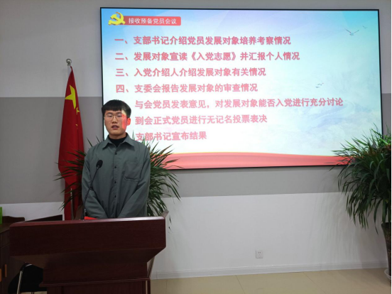 大会严格按照党员发展程序进行,经过党支部严格考察和培养,安效琪等9名发展对象通过群众测评,成绩合格、政审合格,符合发展条件。首先,安效琪等9名发展对象依次汇报了对党的认识、入党动机、以及需要向党组织说明的问题。之后按照规程进行无记名投票方式表决。根据投票结果大会同意接收安效琪等9名党员发展对象为中共预备党员。
