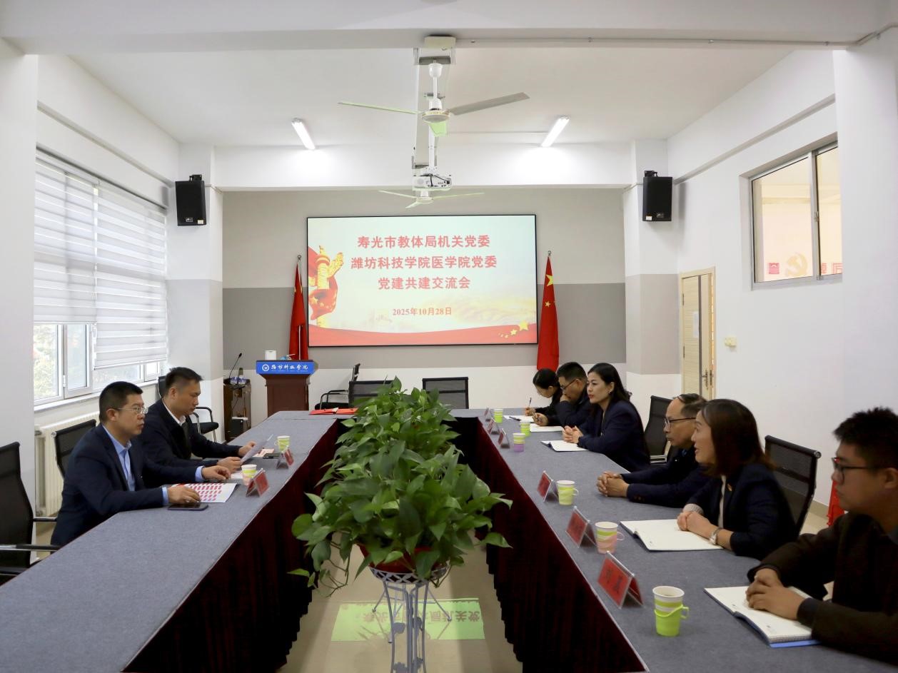 为深入学习贯彻习近平新时代中国特色社会主义思想,以党建联建为动力,深入推进新时代党建示范创建和质量创优工作,充分发挥“全国党建工作样板支部”的辐射带动作用,提升党建工作整体水平,努力构建“资源共享、优势互补、相互促进、共同提高”的党建工作格局。10月28日,医学院党委与寿光市教育局机关党委开展党建共建交流活动并签署党建共建协议,寿光市教体局党组成员、总督学、机关党委副书记栾学涌,寿光市教体局机关党委专职副书记、党建工作科科长李新刚,潍坊科技学院党建办公室主任范绍利、医学院院长田会、党委书记隋海英及其他班子成员参加此次活动。
