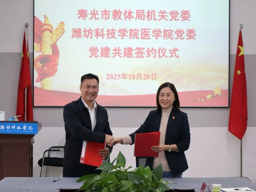 为深入学习贯彻习近平新时代中国特色社会主义思想,以党建联建为动力,深入推进新时代党建示范创建和质量创优工作,充分发挥“全国党建工作样板支部”的辐射带动作用,提升党建工作整体水平,努力构建“资源共享、优势互补、相互促进、共同提高”的党建工作格局。10月28日,医学院党委与寿光市教育局机关党委开展党建共建交流活动并签署党建共建协议,寿光市教体局党组成员、总督学、机关党委副书记栾学涌,寿光市教体局机关党委专职副书记、党建工作科科长李新刚,潍坊科技学院党建办公室主任范绍利、医学院院长田会、党委书记隋海英及其他班子成员参加此次活动。